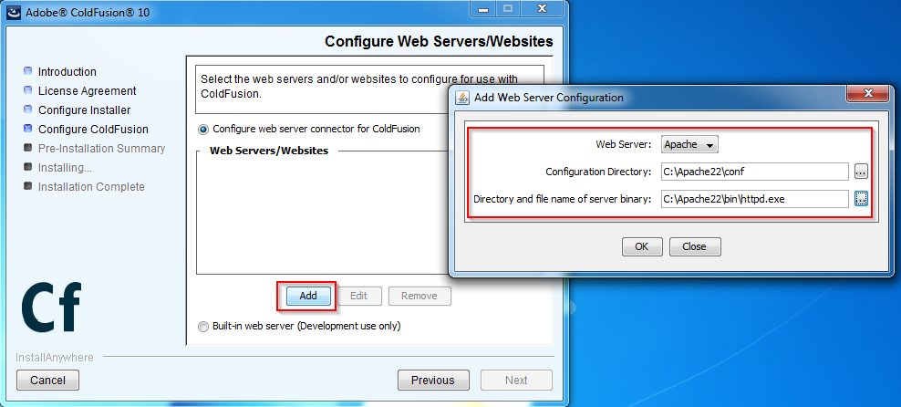 10. Click Add and add Apache server previously installed then click Next on Configure ColdFusion > Configure Web Server/Websites