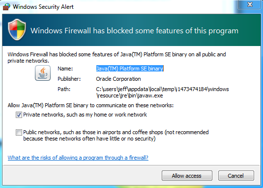 15. During the installation when prompted click Allow access to create the firewall rules to allow remote access for the Java