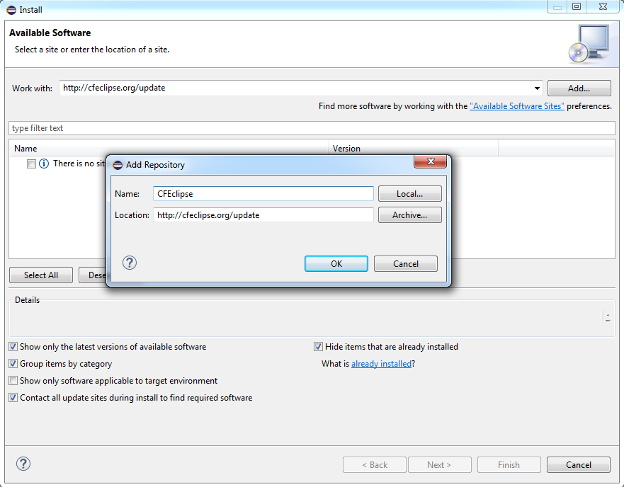 3. For Add Repository as the Name enter CFEclipse and click OK.