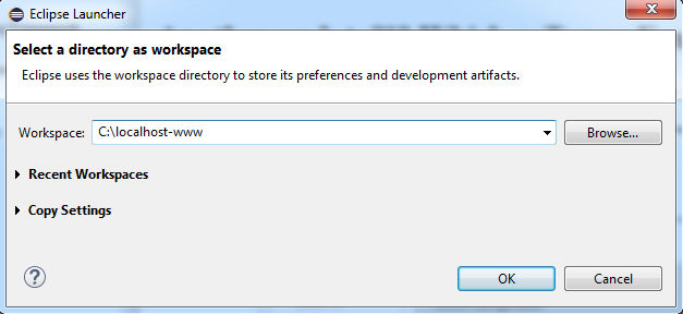 4. The first dialog to be displayed is to Select a directory as workspace. It’s here where we’ll specify our ColdBox folder we created above at C:\localhost-www.