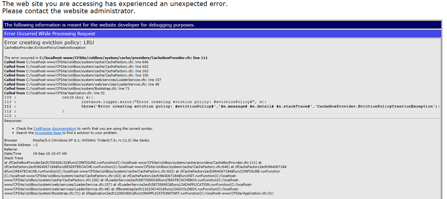 Alternatively you might encounter an error stating “Error creating eviction policy: LRU”. This is due to Coldbox not finding the path to the /coldbox folder and you might need to verify the mappings in the Application file.